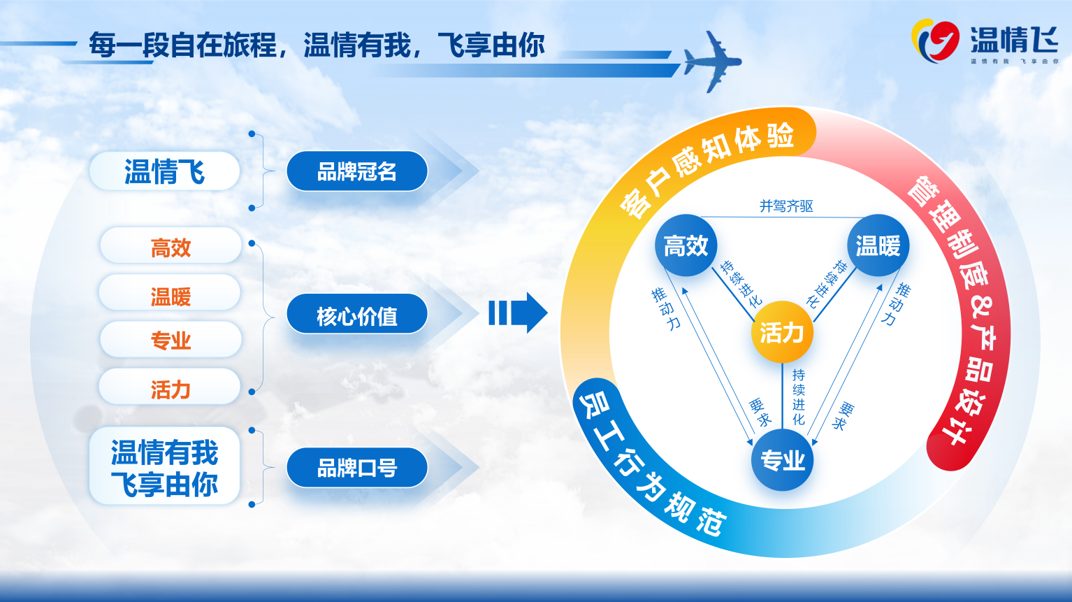 品牌Logo融合英文“Fly”衍生图形与航空元素,凝练为包容呵护的心型结构,传递“温情有我,用心相伴”的服务初心,诠释“飞享由你,自在旅程”的品牌愿景。