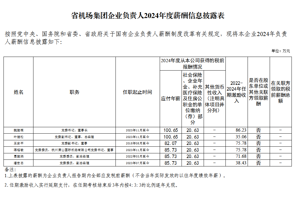 省机场集团企业负责人2024年度薪酬情况